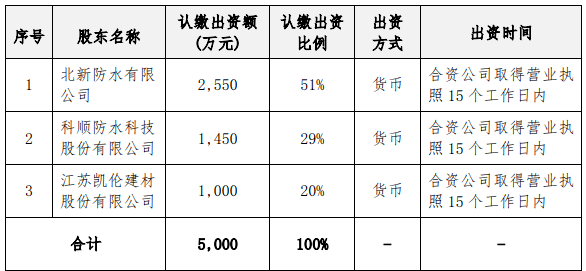 其中凯伦股份以货币方式出资1000万元,出资比例为20%,资金来源为自有资金;北新防水以货币方式出资2550万元,出资比例为51%,资金来源为自有资金;科顺股份以货币方式出资1450万元,出资比例为29%,资金来源为自有资金。