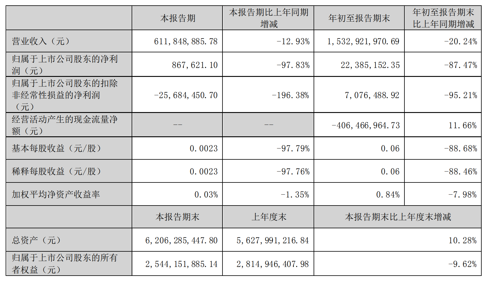 公告显示,2022年第三季度凯伦股份营业收入为6.12亿元,同比减少12.93%;归属于上市公司股东的净利润为86.76万元,同比减少97.83%。前三季度营业收入为15.33亿元,同比减少20.24%;归属于上市公司股东的净利润为2238.52万元,同比减少87.47%。
