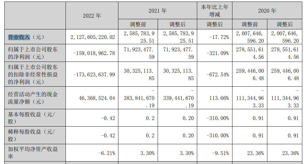 据报告,2022年凯伦股份实现营业收入21.28亿元,比上年同期下降17.72%,实现营业利润-1.86亿元,比上年同期下降339.14%;归属于上市公司股东的净利润-1.59亿元,比上年同期下降321.09%;归属于上市公司股东的扣除非经常性损益的净利润-1.74亿元,同比下降672.54%。