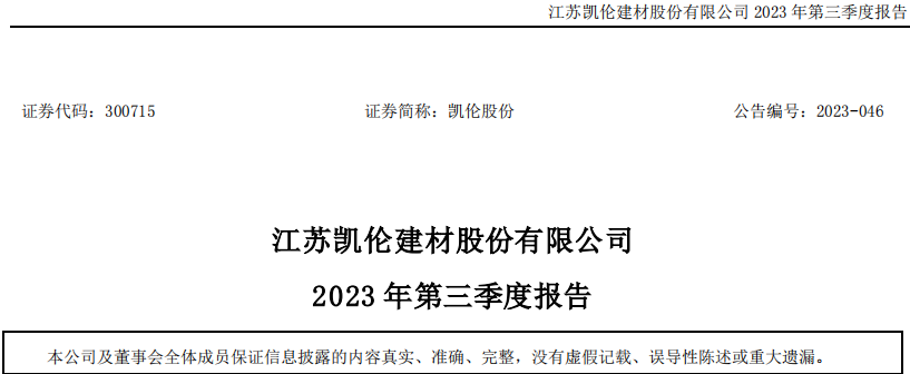 10月25日晚间,江苏凯伦建材股份有限公司(300715.SZ)发布2023年三季度报告。