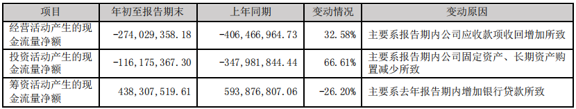 财报显示,凯伦股份经营性活动产生的现金流量净额为-2.74亿元,较上年同期增长32.58%。凯伦股份称,主要系报告期内公司应收款项收回增加所致;
