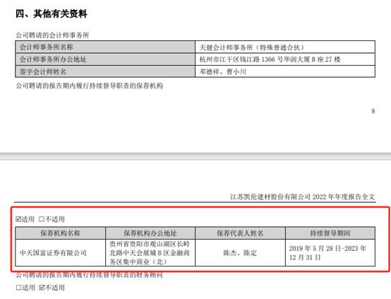公开信息显示,凯伦股份2019年配股的保荐机构为中天国富证券,持续督导期间为2019年5月28日-2023年12月31日。
