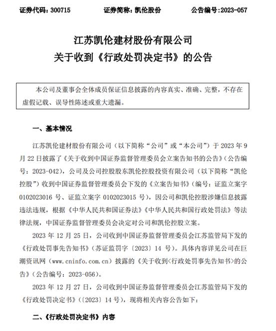 12月27日,凯伦股份公告称,公司收到中国证监会江苏监管局下发的《行政处罚事先告知书》。因存在未及时披露关联方非经营性资金占用、定期报告存在重大遗漏的违法行为,江苏证监局决定对凯伦股份及相关责任人给予警告,并处以罚款。