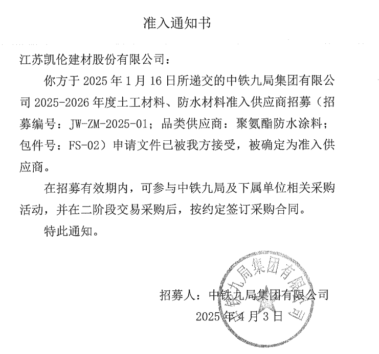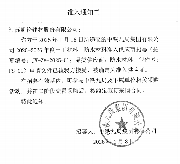 近日,凯伦股份收到了中铁九局集团有限公司的准入通知书,被确定为2025-2026年度防水材料、聚氨酯防水涂料准入供应商。