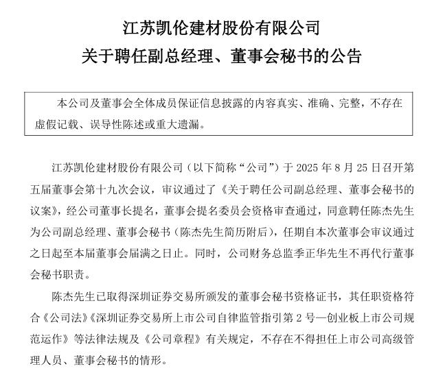 发布半年报当日,凯伦股份公告称,经公司董事长提名,董事会提名委员会资格审查通过,同意聘任陈杰为公司副总经理、董事会秘书。同时,凯伦股份拟为控股子公司提供担保,预计累积额度不超过8,000万元。其中,为苏州凯伦新能源科技有限公司提供连带责任担保,担保总额不超过人民币4,000万元;为湖北纽凯伦轨道交通新材料有限公司提供连带责任担保,担保总额不超过人民币4,000万元。