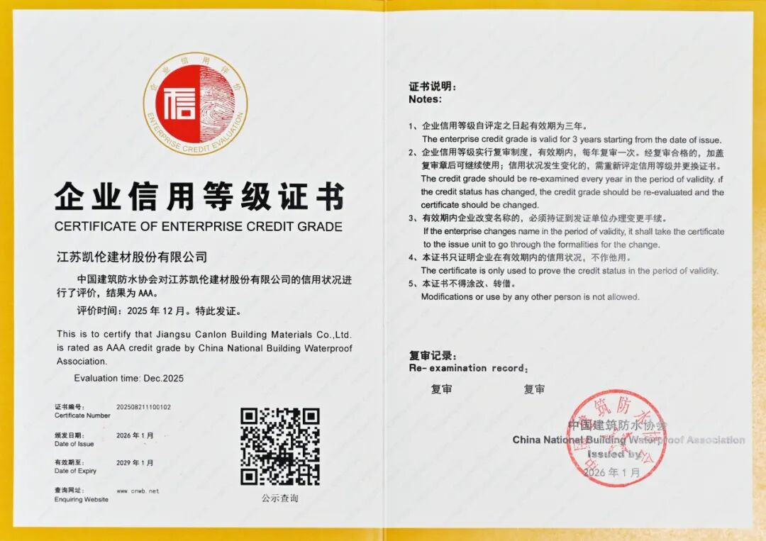 中国建筑防水协会开展的信用评价体系科学、严谨,从企业的基础信用、经营能力、财务实力、管理能力、社会信用及发展趋势等多个维度进行全面评估。AAA级作为该体系的最高级别,代表着企业信用记录优秀、履约能力极强、发展前景广阔。凯伦股份此次获评,直观反映了其在公司治理、产品质量、合同履约、客户服务及社会责任等方面的综合实力达到行业一流水平,为合作伙伴与客户提供了坚实的信心保障。