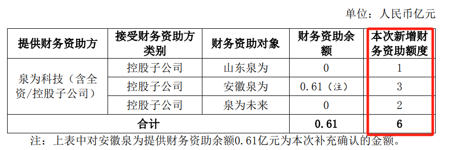 其中,泉为科技计划向旗下控股子公司山东泉为提供1亿元的财务资助额度、向安徽泉为提供3亿元的财务资助额度、向泉为未来新能源技术开发(安徽)有限公司提供2亿元的财务资助额度,合计不超过6亿元。