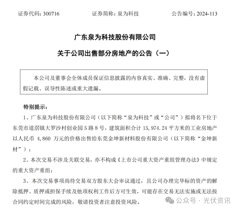 值得注意的是,前不久泉为刚刚发布公告要“卖方干光伏”!某跨界企业卖房干光伏!泉为科技于12月4日与东莞金坤新材料股份有限公司(以下简称“金坤新材”)签署《不动产转让协议》,拟以4860万元的价格将上述房产出售给金坤新材。本次交易主要为进一步聚焦光伏主业,优化资产结构,提高资产使用效率,补充公司流动资金。