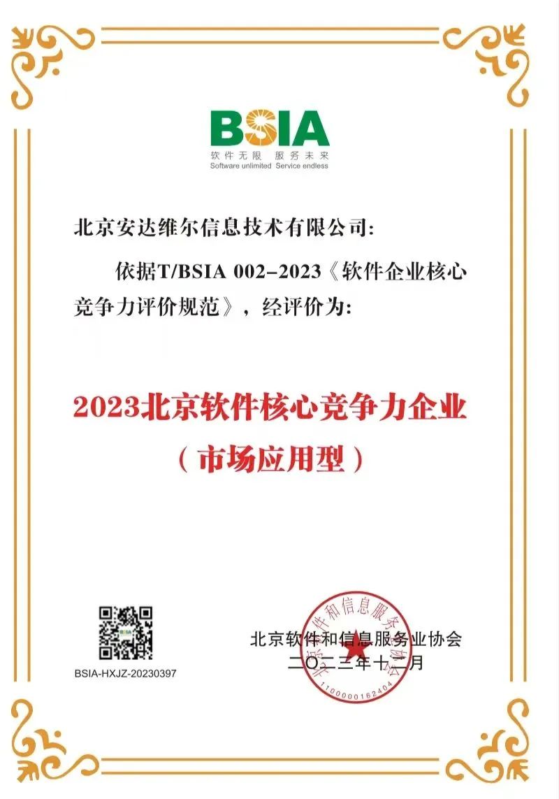 近日,安达维尔全资子公司北京安达维尔信息技术有限公司被评选为2023北京软件核心竞争力企业(市场应用型)。这一荣誉的获得,既是对北京安达维尔信息技术有限公司技术实力和市场应用能力的肯定,更是对安达维尔信息业务的鼓励和鞭策。