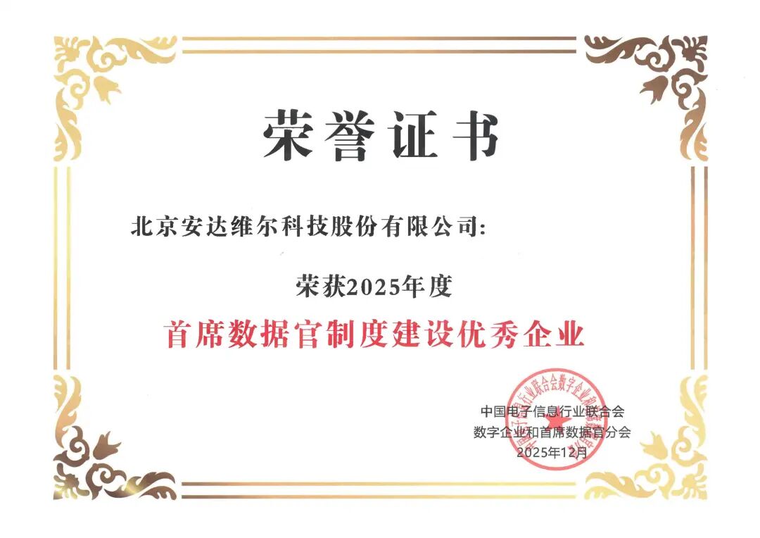 近日,在由中国电子信息行业联合会数字企业和首席数据官分会主办的2025“数字新力量”全国行活动(北京站)暨首席数据官制度与高质量数据集建设交流会上,北京安达维尔科技股份有限公司(以下简称“安达维尔”)凭借其在数据治理、首席数据官(CDO)制度建设方面的卓越实践,被授予“2025年度首席数据官制度建设优秀企业”荣誉称号。