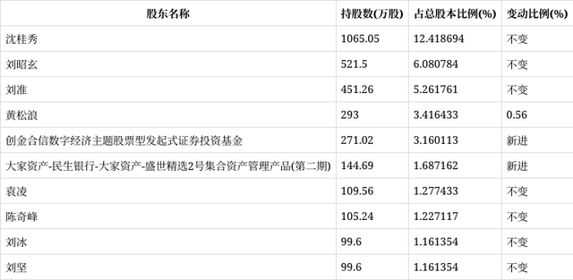 三季报显示,2022年三季度末的公司十大流通股东中,新进股东为创金合信数字经济主题股票型发起式证券投资基金、大家资产-民生银行-大家资产-盛世精选2号集合资产管理产品(第二期),取代了二季度末的杜辉雯、马燕平。在具体持股比例上,黄松浪持股有所上升。