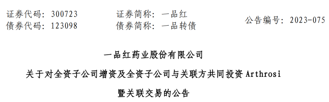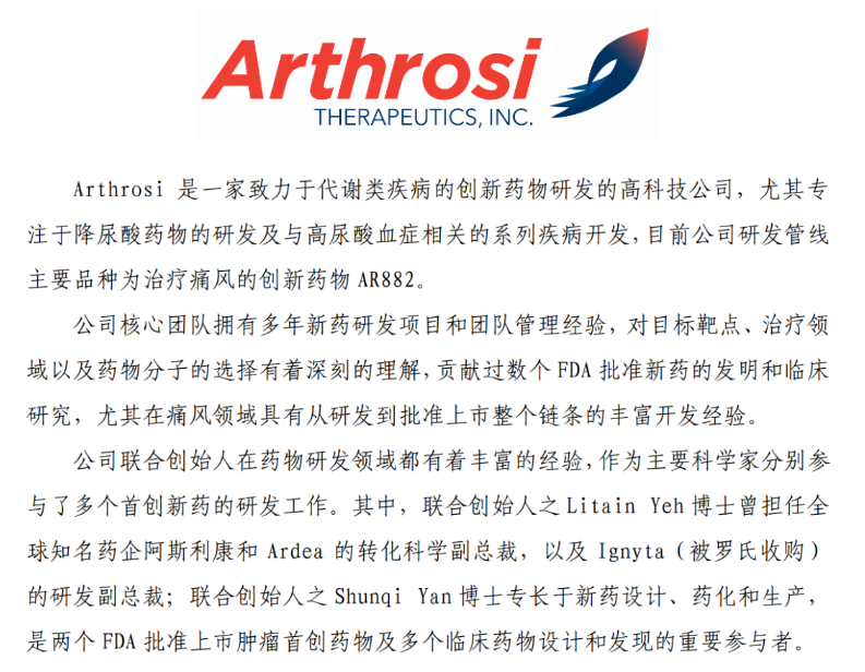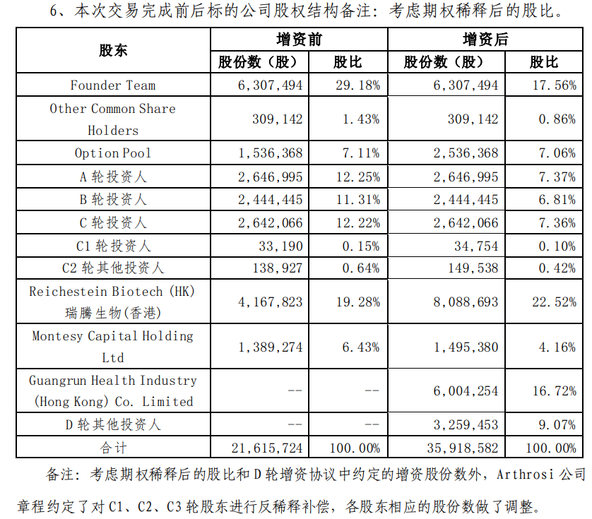 近日,一品红药业宣布子公司广州瑞腾生物以自有资金2500万美元(折合人民币约1.8亿元)对瑞騰生物(香港)有限公司(英文名:Reichstein Biotech (HK) Co.Limited,简称“瑞騰生物(香港)”)增资,其中2100万美金用于参与 Arthrosi Therapeutics的D轮优先股融资。增资完成后,瑞騰生物(香港)将获得Arthrosi新发股份3,602,552股。同时一品红关联方Guangrun Health Industry (Hong Kong) Co.Limited将出资3500万美元认购6,004,254股,占比16.72%,其他D轮投资人认购1900万美元。Arthrosi公司估值达到2.09亿美元。一品红及其关联主体共持有Arthrosi公司43.4%股份。