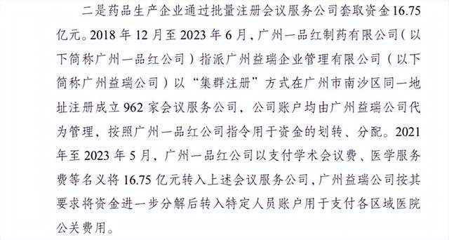 2021年至2023年5月,一品红以支付学术会议费、医学服务费等名义将16.75亿元转入上述会议服务公司,广州益瑞公司按其要求将资金进一步分解后转入特定人员账户用于支付各区域医院公关费用。