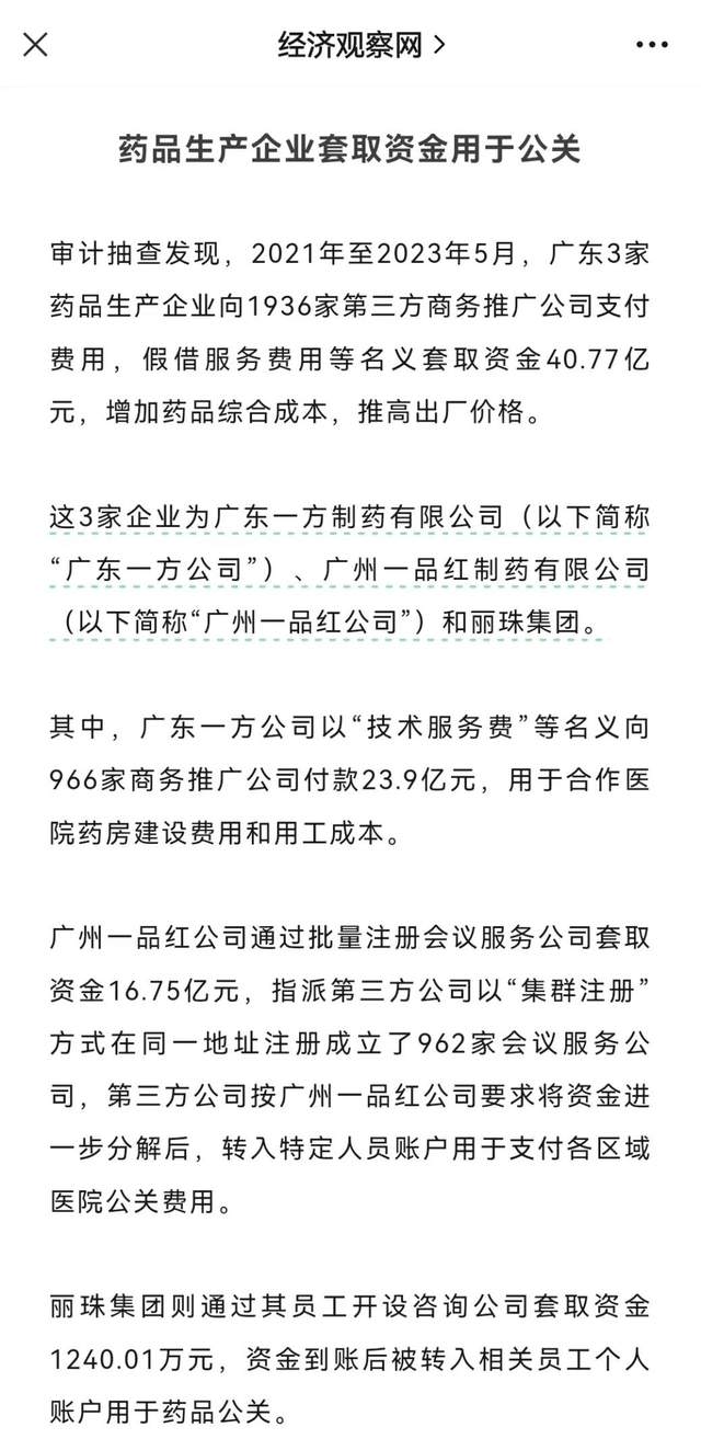 其中,2021年至2023年5月,广东3家药企向1936家第三方商务推广公司支付费用,假借服务费用等名义套取资金40.77亿元,增加药品综合成本,推高出厂价格。