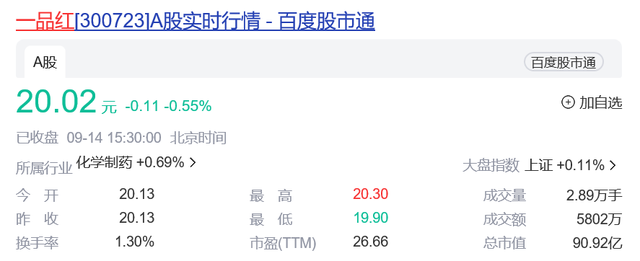 截至9月14日收盘,一品红股价报20.02元,总市值90.92亿元。
