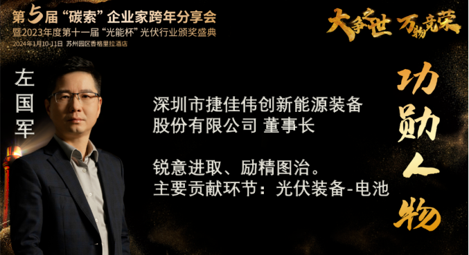 近日,由索比光伏网主办的第五届“碳索”企业家跨年分享会暨2023年度第十一届“光能杯”光伏行业颁奖盛典在苏州举行。会上,索比光伏网评选出“光伏二十年功勋人物”,捷佳伟创董事长左国军先生荣登榜单,与光伏行业内做出过突出贡献的企业家、专家学者们共享这份殊荣。