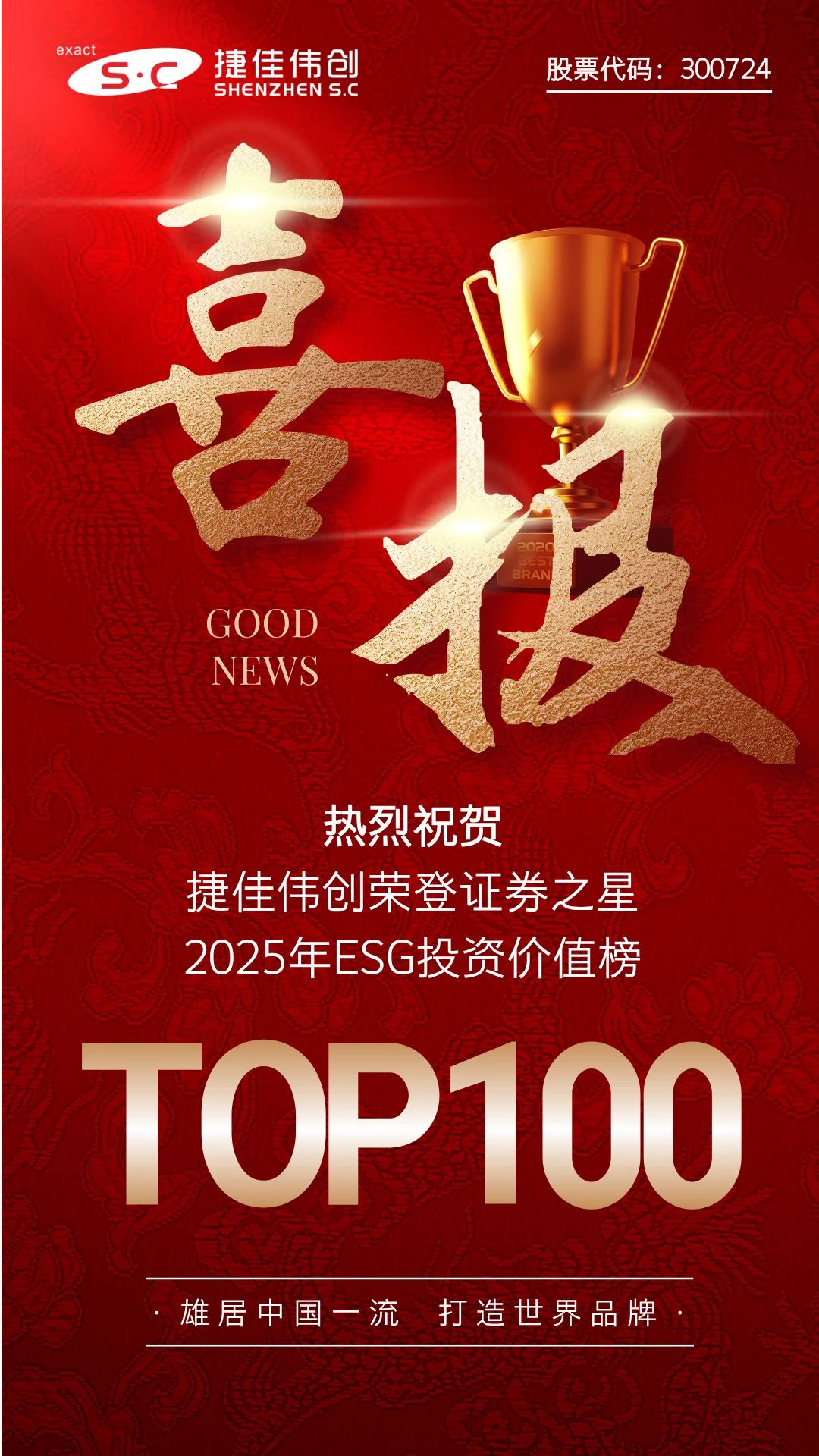 喜报!捷佳伟创荣登证券之星“2025年ESG投资价值榜TOP100”