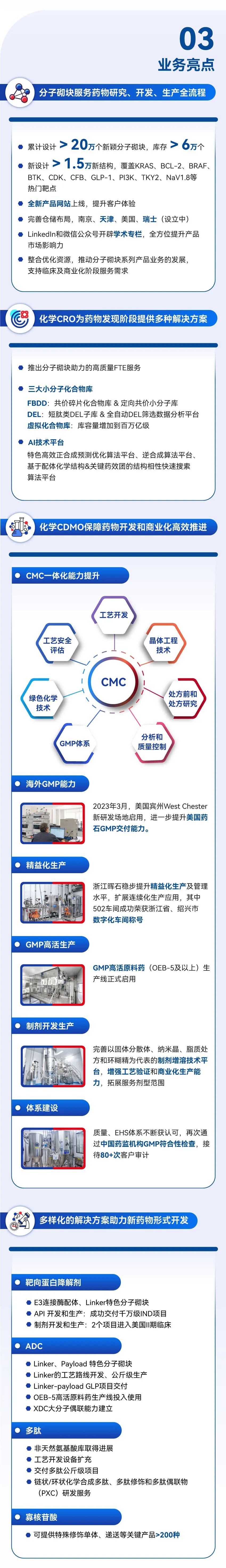 药石科技以其新颖、独特的分子砌块及相关化合物库筛选技术助力药物发现;并搭建一体化CMC平台,为创新药研发及商业化项目提供高效、高品质的中间体、原料药和药物制剂的工艺开发和生产服务。同时,公司整合多年来在连续流化学、微填充床技术、催化技术、药物晶体工程技术、智能制造等前沿技术上的能力积累,积极探索生物医药领域绿色、安全和智能化的先进制造及服务模式,促进行业创新发展。