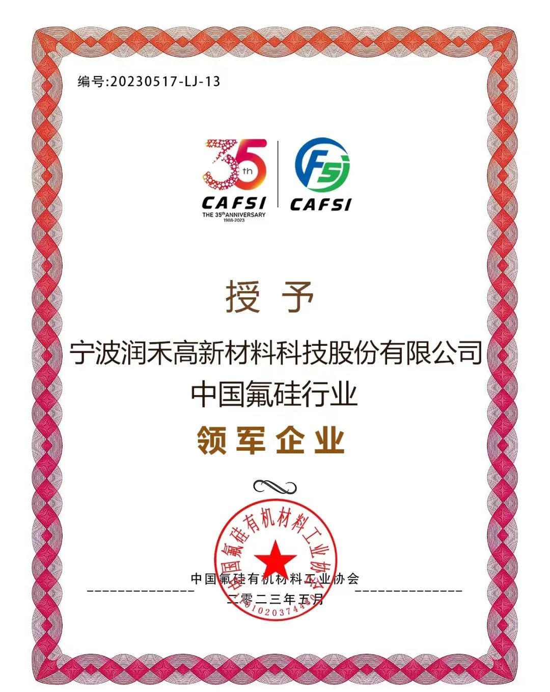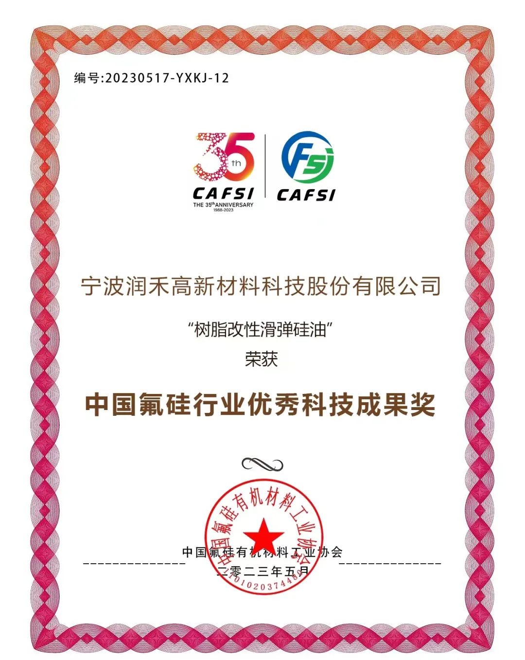 在大会颁奖庆典上,润禾材料荣获“中国氟硅行业领军企业”称号,并凭借“树脂改性滑弹硅油”项目获评“中国氟硅行业优秀科技成果奖”,董事长叶剑平凭借多年来在业内的贡献,荣获“中国氟硅行业功勋成就奖”,我司纺化事业部技术副总监杨振获评“中国氟硅行业先进科技工作者”称号。