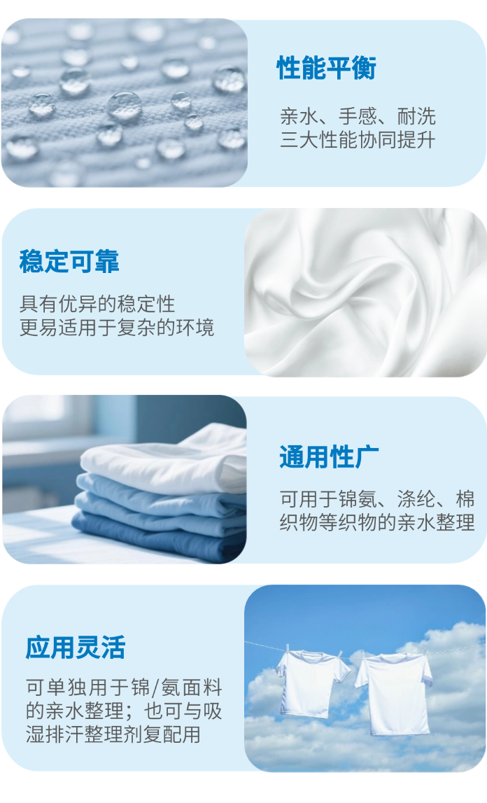 而市面上的亲水柔软整理剂,在亲水、耐洗、手感等方面多存在矛盾点难以平衡,应对复杂环境的能力也较弱。