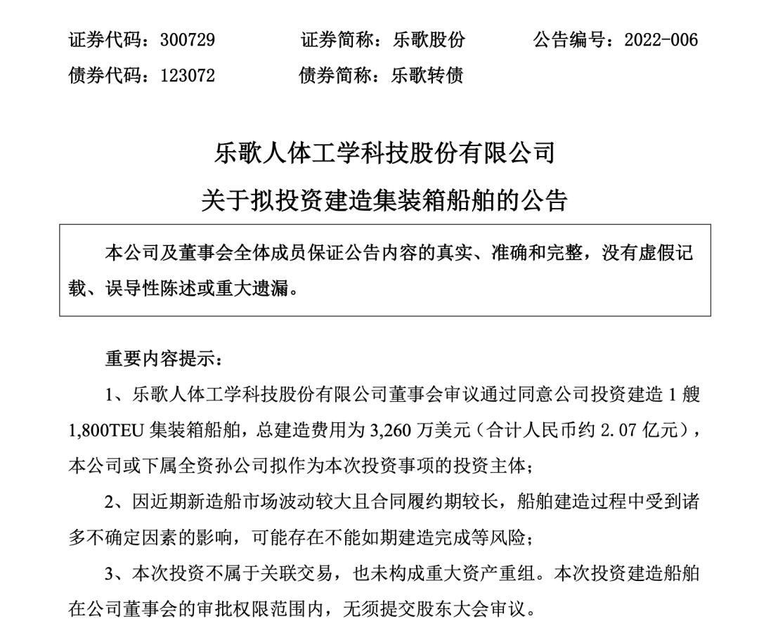 航运界网消息,此前因点名喊话船公司呼吁合理涨价而引来航运媒体关注的乐歌股份(300729),1月27日晚间发布公告称,为进一步提升公司竞争力,加速公司境外业务发展,拟与黄海造船厂签订1艘1,800TEU集装箱船舶建造合同,上述集装箱船舶建造总价3260万美元(合计人民币约2.07亿元人民币)。