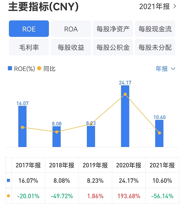 从净资产收益率(ROE)来看,2017年-2021年,乐歌股份ROE分别为16.07%、8.08%、8.23%、24.17%、10.6%。