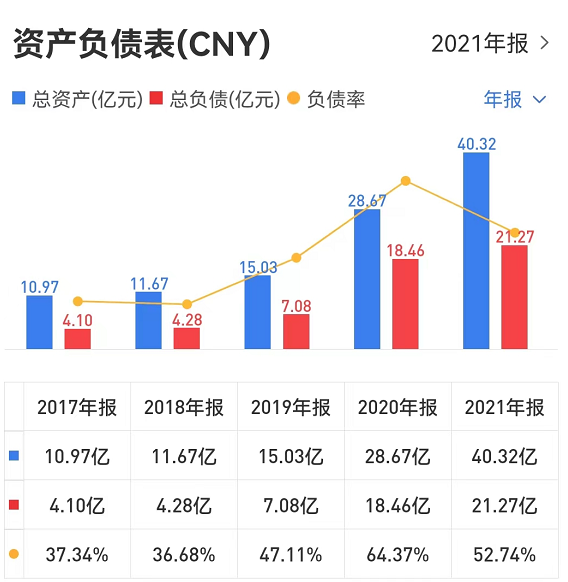 2017年-2021年,乐歌股份总负债分别为4.1亿元、4.28亿元、7.08亿元、18.46亿元、21.27亿元,总负债连年攀升。