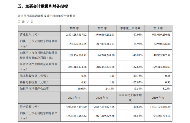 报告显示,乐歌股份2021年度实现营收28.71亿元,比上年同期增长47.95%;归属上市公司股东净利润1.85亿元,比上年同期下降14.93%。经营活动产生的现金流量净额2.65亿元,同比增长22.63%;基本每股收益0.85元,拟每10股派发现金红利2元(含税)。