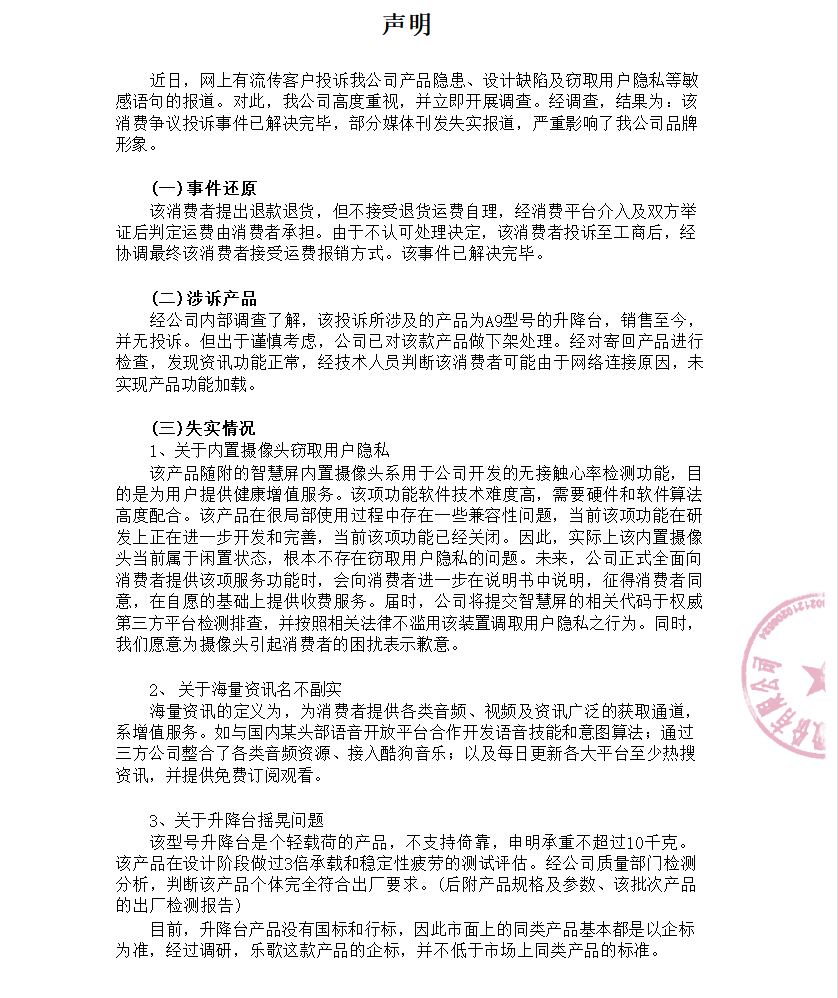 乐歌股份称,“经公司内部调查了解,该投诉所涉及的产品为A9型号的升降台,销售至今,并无投诉。但出于谨慎考虑,公司已对该款产品做下架处理。经对寄回产品进行检查,发现资讯功能正常,经技术人员判断该消费者可能由于网络连接原因,未实现产品功能加载。”
