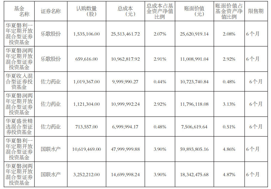 2022年12月13日,华夏基金公告,公司旗下基金参加了乐歌人体工学科技股份有限公司(证券简称:乐歌股份,代码:300729)、浙江佐力药业股份有限公司(证券简称:佐力药业,代码:300181)、湛江国联水产开发股份有限公司(证券简称:国联水产,代码:300094)非公开发行A股股票的认购。根据《关于基金投资非公开发行股票等流通受限证券有关问题的通知》等有关规定,公司现将旗下公募基金投资乐歌股份、佐力药业、国联水产本次非公开发行A股股票的相关信息公告如下: