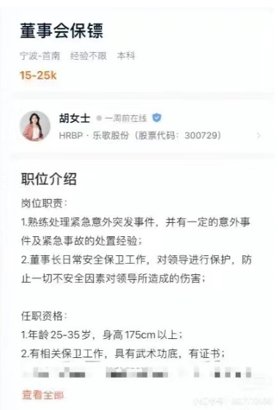 据此前招聘信息,乐歌股份需招聘一名“具有武术功底、有证书”的人士,并表示该人士需进行“董事长日常安全保卫工作,对领导进行保护”等,岗位薪资为1.5万元-2.5万元。