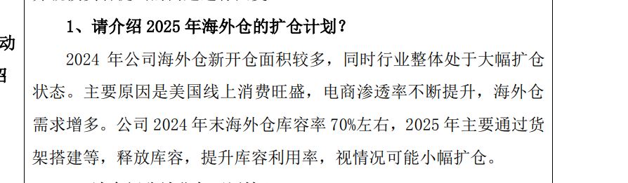 关于2025年海外仓的扩仓计划,乐歌股份称,公司2024年末海外仓库容率70%左右,2025年主要通过货架搭建等,释放库容,提升库容利用率,视情况可能小幅扩仓。