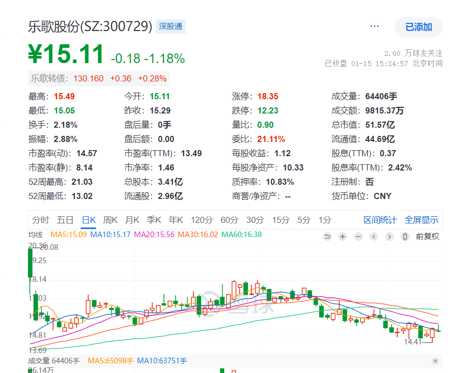 乐居财经李兰 1月15日,截至收盘,乐歌股份(300729.SZ)股价跌1.18%,报15.11元,总市值为51.57亿元。
