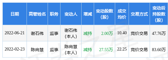 证券之星讯,根据6月22日市场公开信息、上市公司公告及交易所披露数据整理,科创信息(300730)(300730)最新董监高及相关人员股份变动情况:2022年6月21日公司监事谢石伟共减持公司股份2.0万股,占公司总股本为0.0083%。变动期间公司股价上涨1.45%,6月21日当日收盘报10.48元。