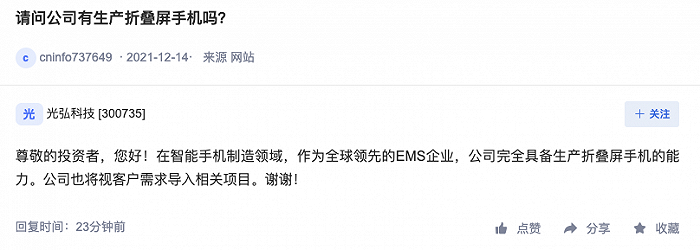 光弘科技12月25日在深交所“互动易”平台回答投资者提问时称:在智能手机制造领域,作为全球领先的EMS企业,公司完全具备生产折叠屏手机的能力。公司也将视客户需求导入相关项目。