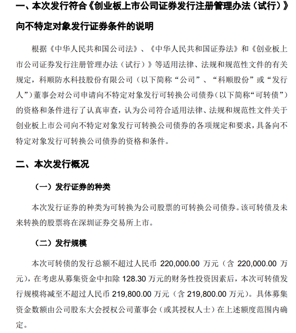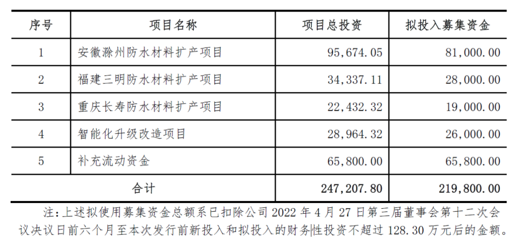 近日,科顺股份(或称“公司”)发布《第三届董事会第十六次会议决议公告》称,方案调整后,本次发行募集资金总额不超过人民币220,000.00万元(含发行费用),在考虑从募集资金中扣除128.30万元的财务性投资因素后,本次可转债发行规模将减至不超过人民币219,800.00万元(含发行费用)。扣除发行费用后将投资于安徽滁州防水材料扩产项目、福建三明防水材料扩产项目、重庆长寿防水材料扩产项目、智能化升级改造项目以及用于补充流动资金,具体如下:
