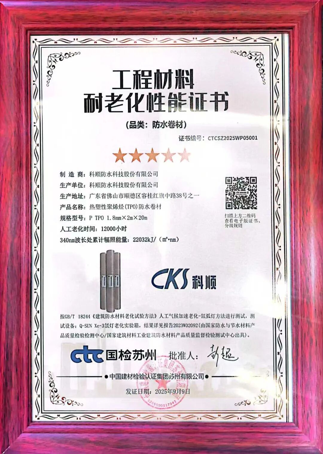 凭借对产品品质的极致追求,科顺股份旗下共三款TPO防水卷材,均获最高级别的“五星级”认证。该认证是高分子防水卷材耐用性的权威衡量标准,其中“五星级”代表行业最高水平。