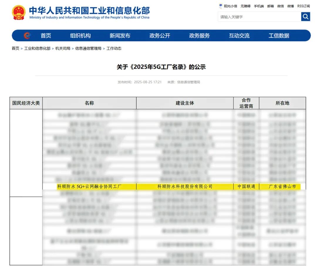 近日,工业和信息化部正式发布《2025年5G工厂名录》,凭借在数字化转型与智能制造领域的卓越实践,科顺股份「5G+云网融合协同工厂」成功入选,成为本次唯一上榜的防水企业。