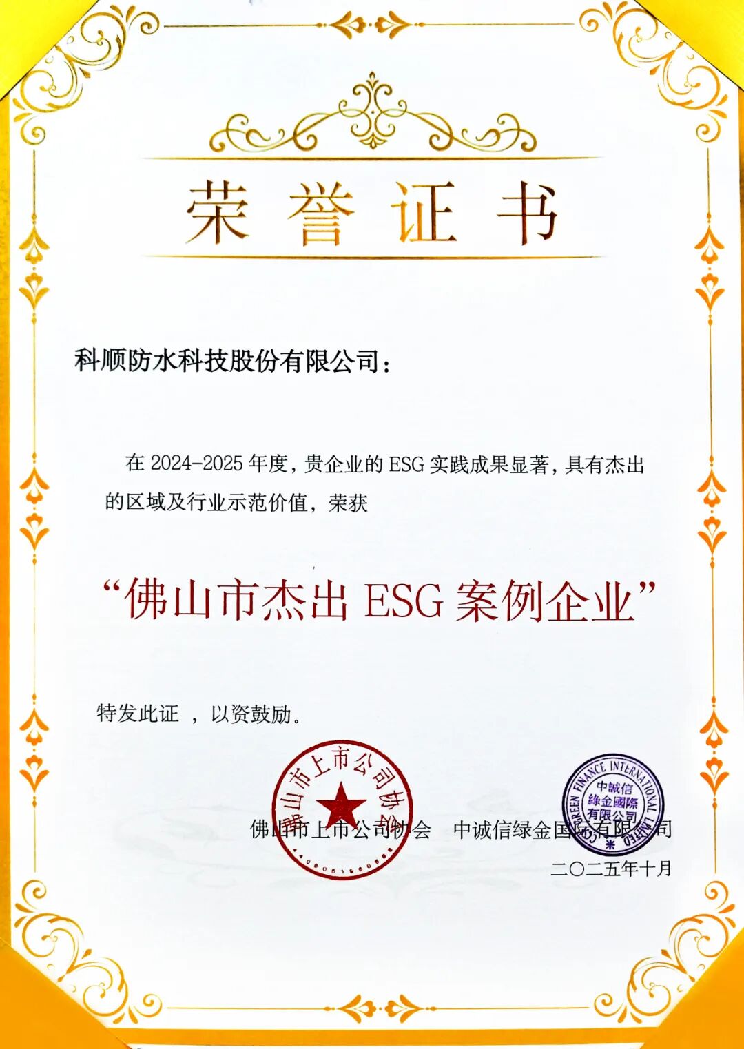 此次获奖,既是佛山市政府与行业对科顺ESG工作的高度认可,更是对公司未来深化可持续发展的激励。