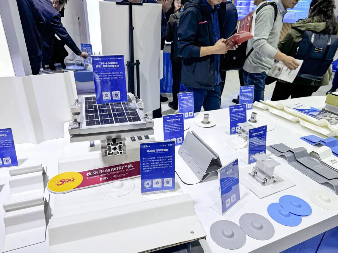 TPF塑钢瓦系统成为现场焦点,专为光伏及工业屋面设计,兼具防水、防腐、耐候性能,提供TPF-470直立锁边和TPF-840梯形瓦两种板型,25年以上耐久寿命,解决屋面渗漏问题。