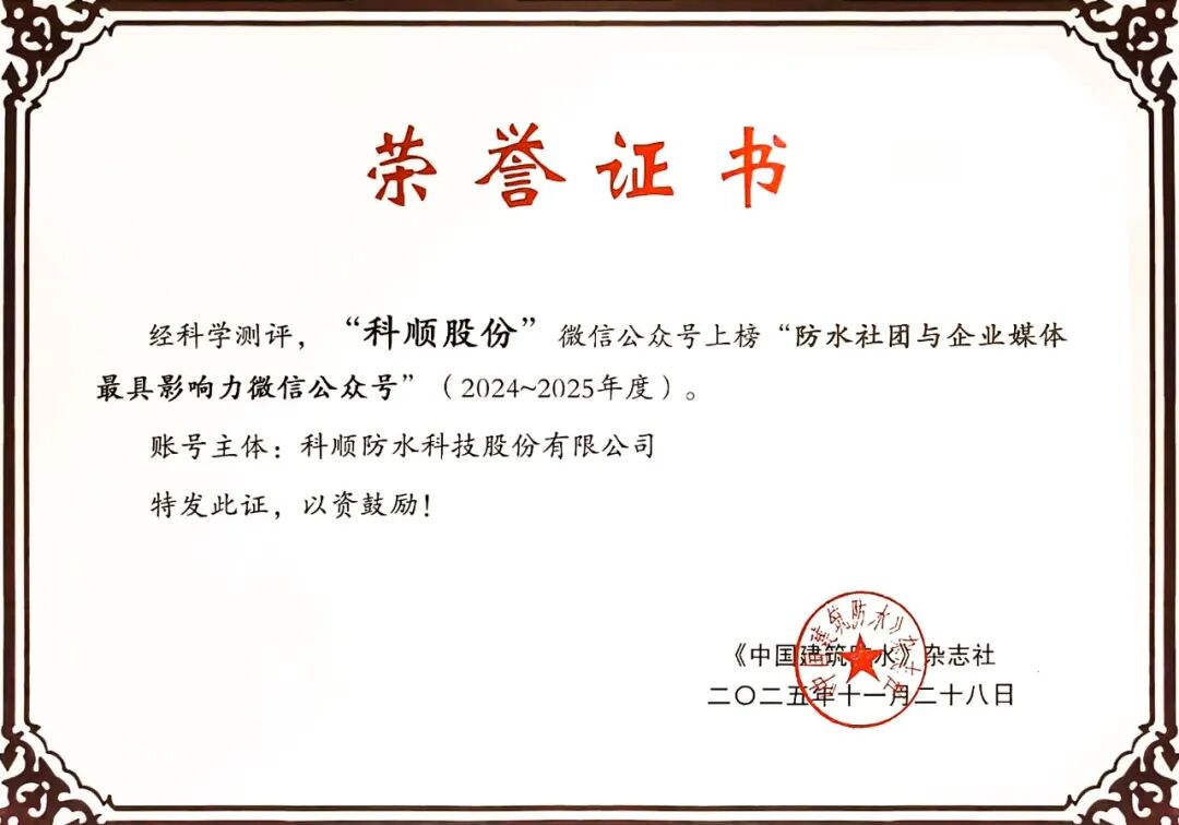 作为企业文化宣传与行业价值传递的核心载体, 科顺股份 微信公众号自运营以来,始终以原创为底色,既聚焦企业技术成果、工程实践等核心内容,又紧密跟进防水行业政策导向与发展动态,在传递品牌价值的同时,全力助推防水行业高质量发展。这份荣誉不仅是对科顺品牌传播工作专业性的认可,更是对其在行业内传播影响力的肯定。