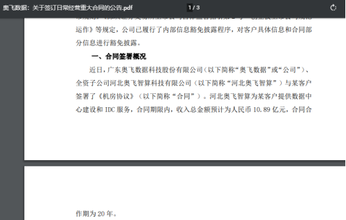 8月12日晚,奥飞数据发布公告称,公司及其全资子公司河北奥飞智算科技有限公司与一家客户签订了合同,将为客户提供数据中心建设和IDC服务。