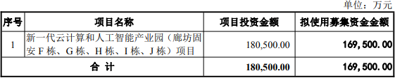 2025年8月20日,奥飞数据发布的2025年度向特定对象发行A股股票募集说明书显示,公司本次向特定对象发行股票募集资金总额不超过人民币169,500.00万元,扣除发行费用后,将用于新一代云计算和人工智能产业园(廊坊固安F栋、G栋、H栋、I栋、J栋)项目。