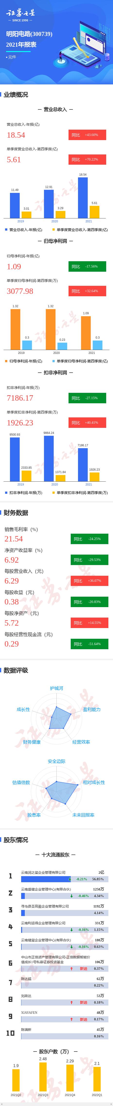 明阳电路2021年报显示,公司主营收入18.54亿元,同比上升43.6%;归母净利润1.1亿元,同比下降17.56%;扣非净利润7186.17万元,同比下降27.15%;其中2021年第四季度,公司单季度主营收入5.62亿元,同比上升70.22%;单季度归母净利润3077.98万元,同比上升32.64%;单季度扣非净利润1926.24万元,同比上升40.41%;负债率46.33%,投资收益2830.7万元,财务费用3186.92万元,毛利率21.54%。