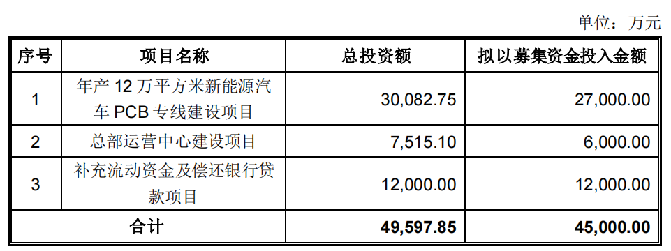 昨日晚间,明阳电路发布了《向不特定对象发行可转换公司债券预案》。本次拟发行可转换公司债券总额不超过人民币45,000.00万元,扣除发行费用后,募集资金净额拟投资于以下项目:年产12万平方米新能源汽车PCB专线建设项目、总部运营中心建设项目、补充流动资金及偿还银行贷款项目。