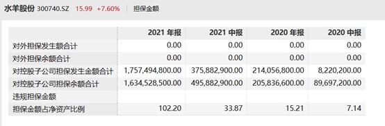 2021年6月之后,水羊股份频繁为子公司提供担保。2021年中报显示,公司提供担保余额为4.96亿元,同比增长450%。2021年底,公司提供担保余额达到16.3亿元,同比增长695%。水羊股份提供担保的余额已经超过其净资产,占比为102%。