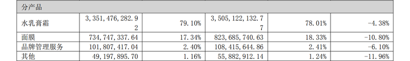分产品来看,该公司水乳膏霜、面膜、品牌管理服务以及其他产品营收均出现了不同程度下滑。水乳膏霜在2024年实现营业收入33.51亿元,同比减少4.38%,营收占比为79.1%;面膜产品营业收入同比减少10.8%至7.35亿元,在营业收入中的占比由上年同期的18.33%降至17.34%;品牌管理服务实现营业收入1.02亿元,同比下滑6.1%;其他产品的营业收入则同比减少11.96%至4919.79万元。