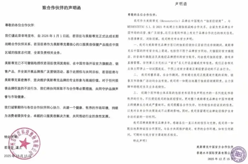 这份声明所指向的“第三方”,正是另一家上市公司若羽臣。2025年12月底,若羽臣高调宣布,自2026年1月1日起正式成为美斯蒂克核心口服美容产品线的中国区域独家总代理,合同期限三年。
