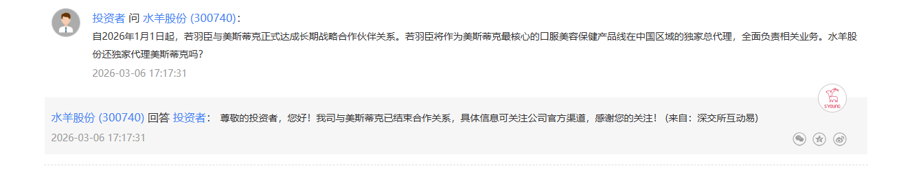 (水羊股份在投资者互动平台回复,已和美斯蒂克结束合作关系。)