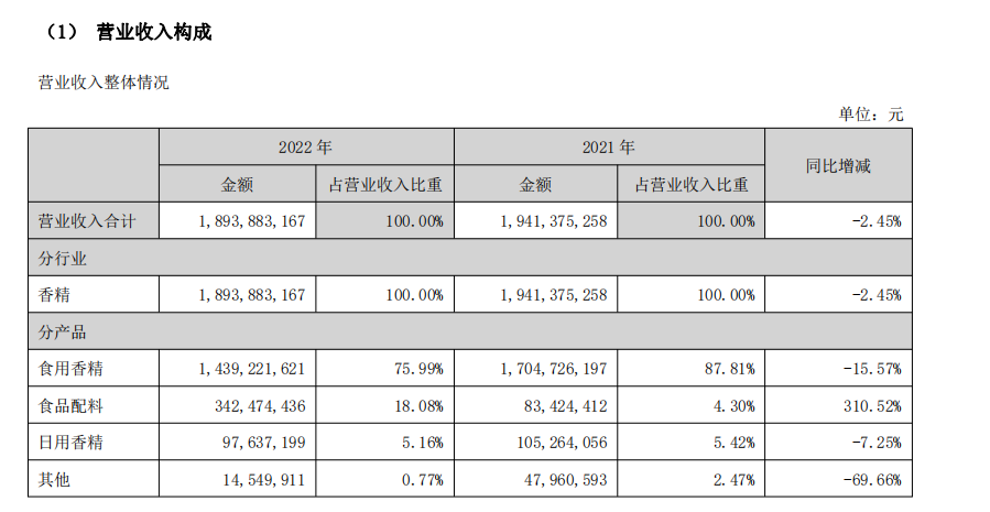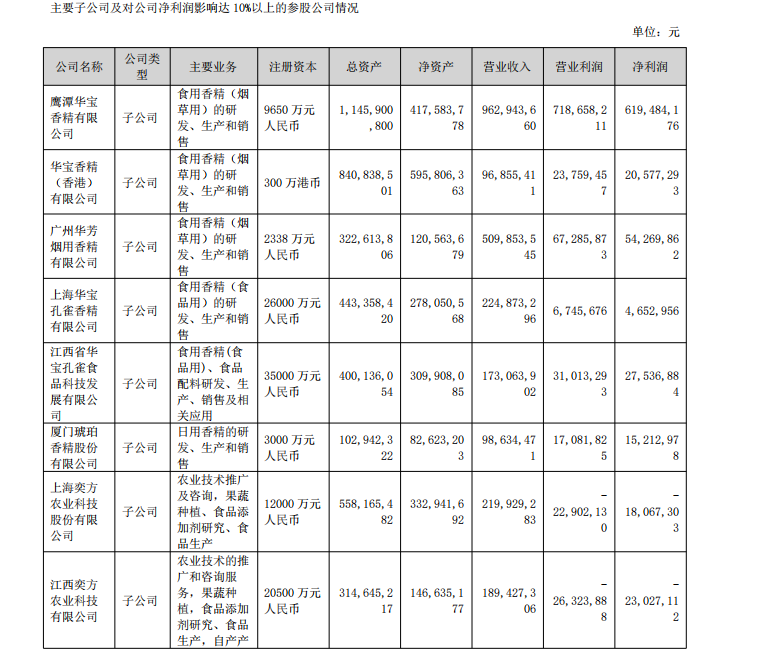 其中,鹰潭华宝香精有限公司是公司最主要的经营平台。2022年,其营业收入合计9.63亿元,对应净利润6.19亿元;上年同期,上述两项指标对应的经营数据分别为10.40亿和6.52亿元。